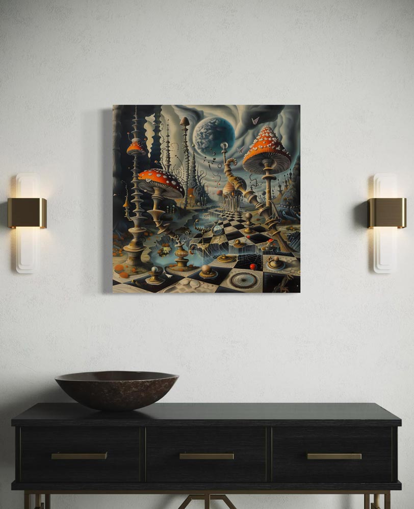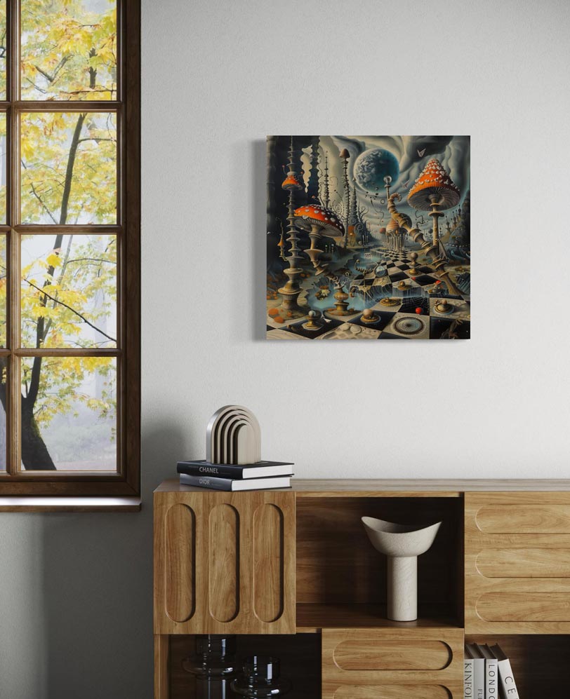 This unique artwork invites the viewer into a symbolic cosmic game, where logic and chaos intertwine. A striking piece that sparks curiosity, it’s ideal for lovers of visionary art, fantasy landscapes, or bold interior design.