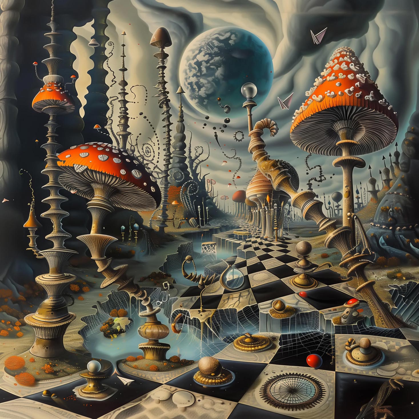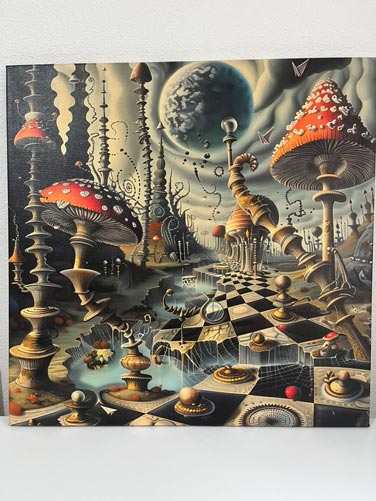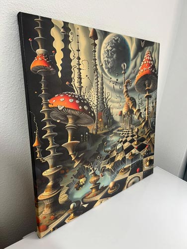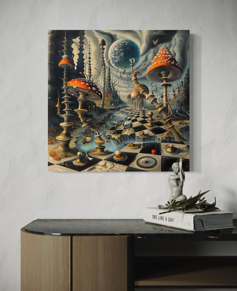 Step into a mesmerizing alien dreamscape with Alien Chessboard, a surreal giclée canvas that merges science fiction, fantasy, and abstract geometry. Gigantic mushrooms, twisted towers, floating chess pieces, and an otherworldly planet hovering in the sky all create a mind-bending, imaginative atmosphere that evokes the works of Dali and Moebius.