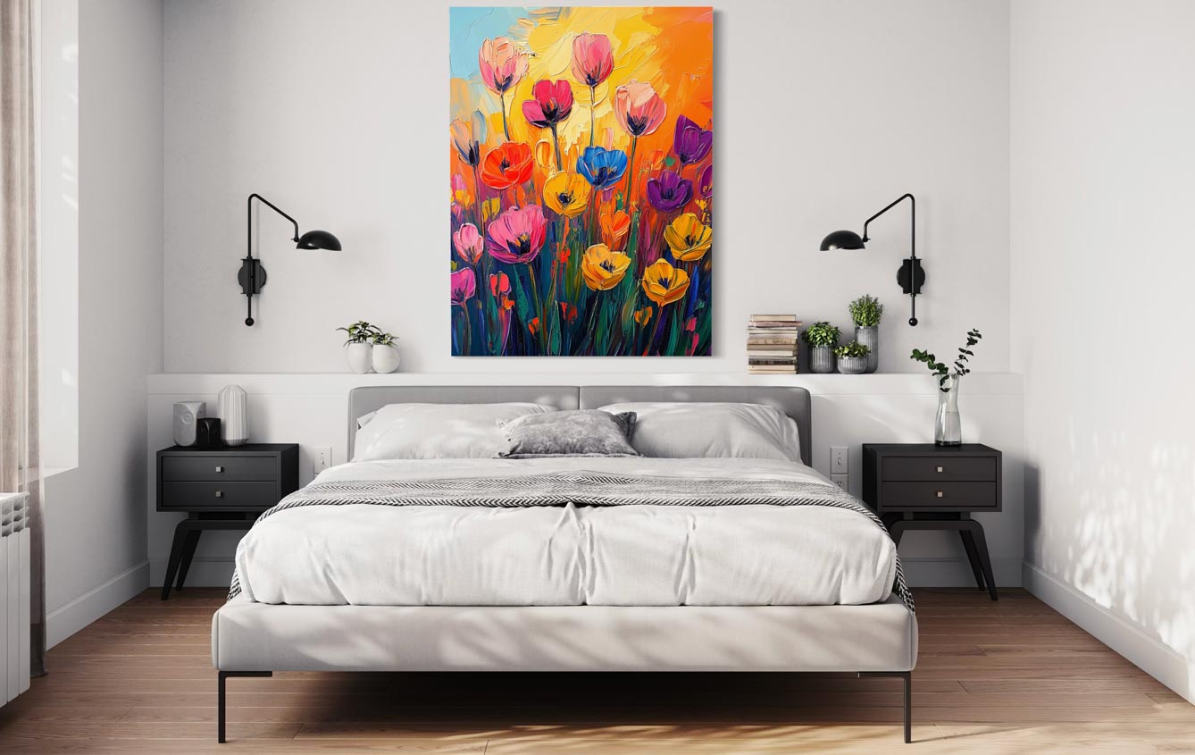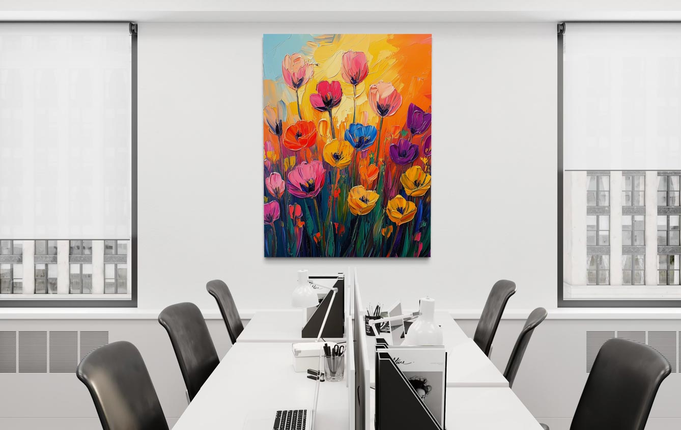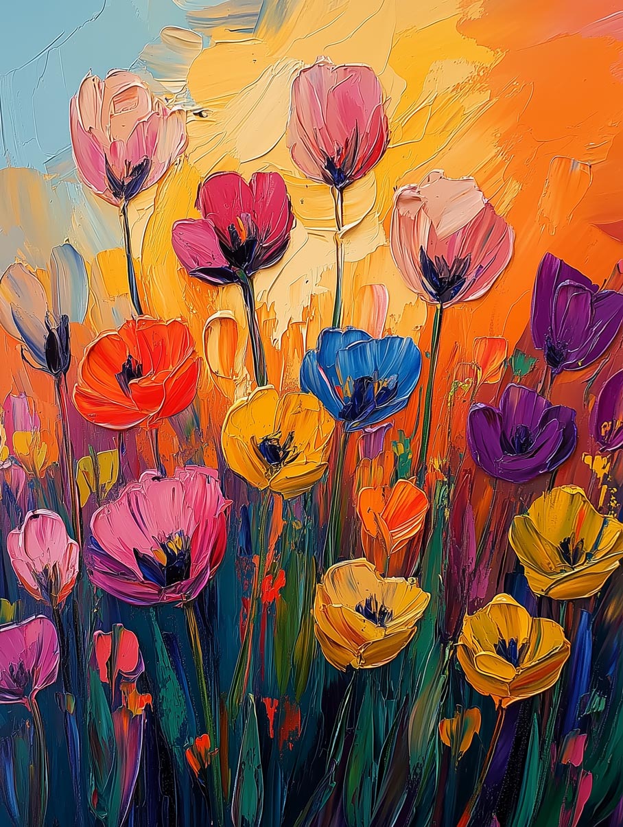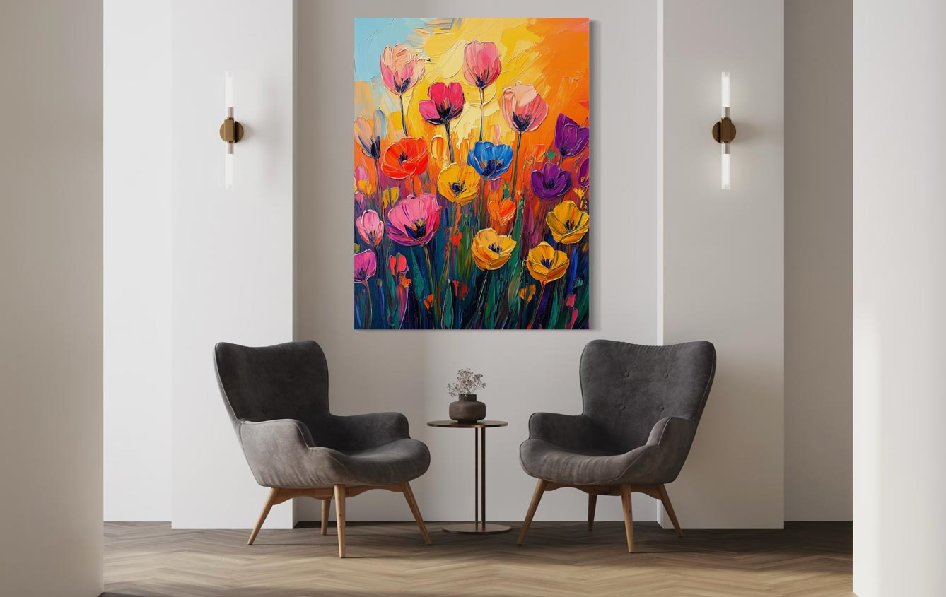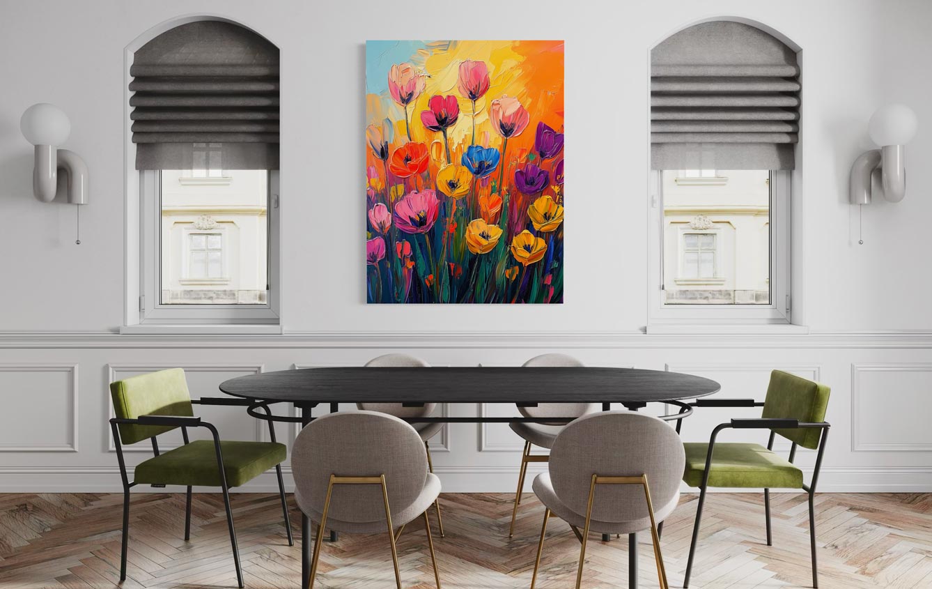 Bring your space to life with this radiant giclée canvas print of bold, painterly wildflowers. “Color Bloom” captures the joy and movement of a blooming meadow in full color explosion — vibrant tulips, poppies, and spring flowers rendered in expressive impasto brushstrokes. Every petal feels alive, layered with texture and bursting with warm hues of yellow, red, pink, violet, and blue.