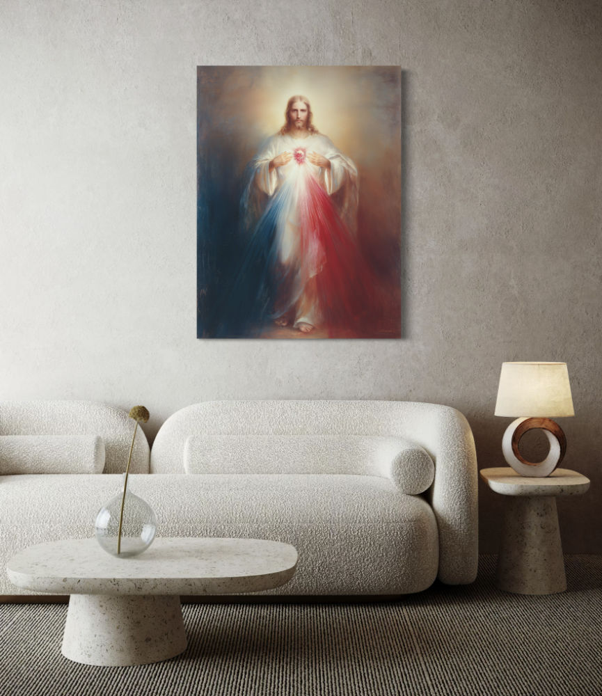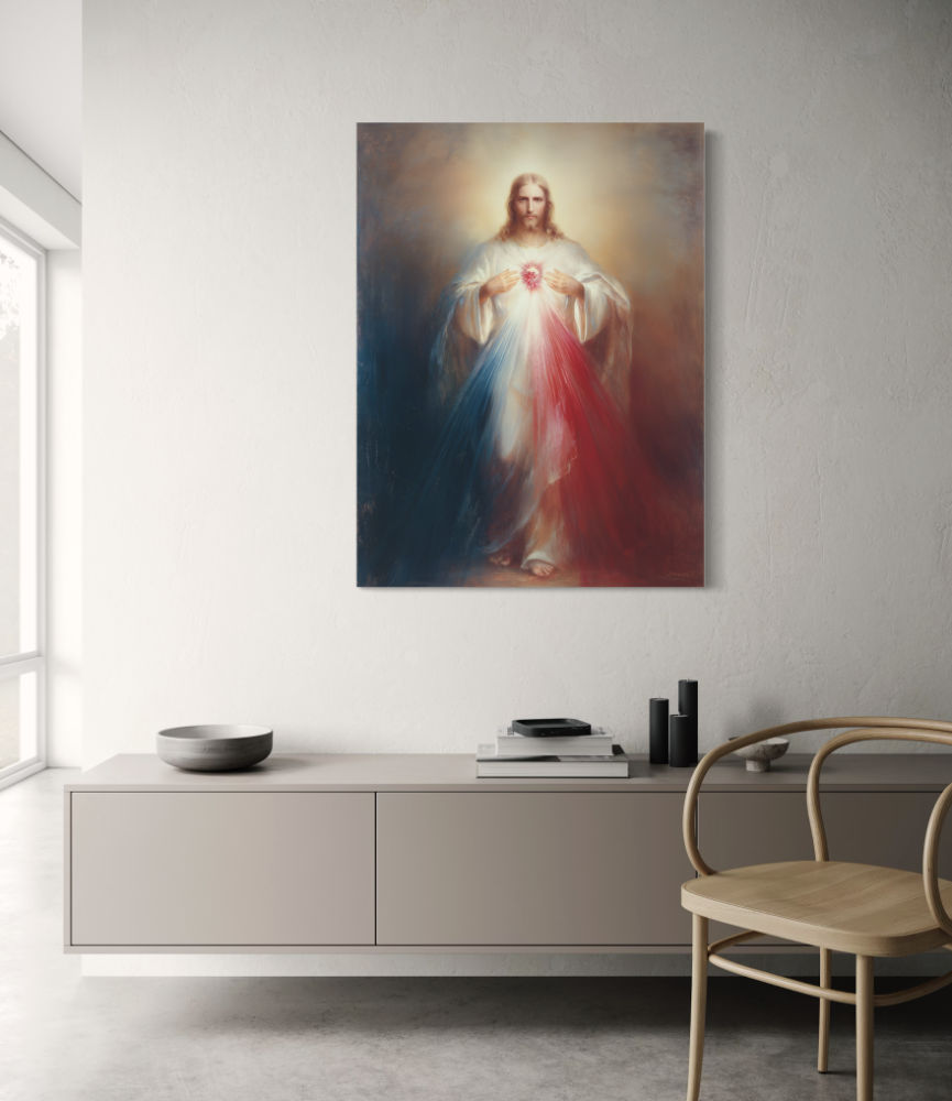 A sublime Giclée canvas print of the Divine Mercy of Jesus, radiating rays of red and white light symbolizing blood and water — the essence of compassion and salvation. The serene gaze of Christ and the flowing light from His heart embody mercy, peace, and forgiveness.