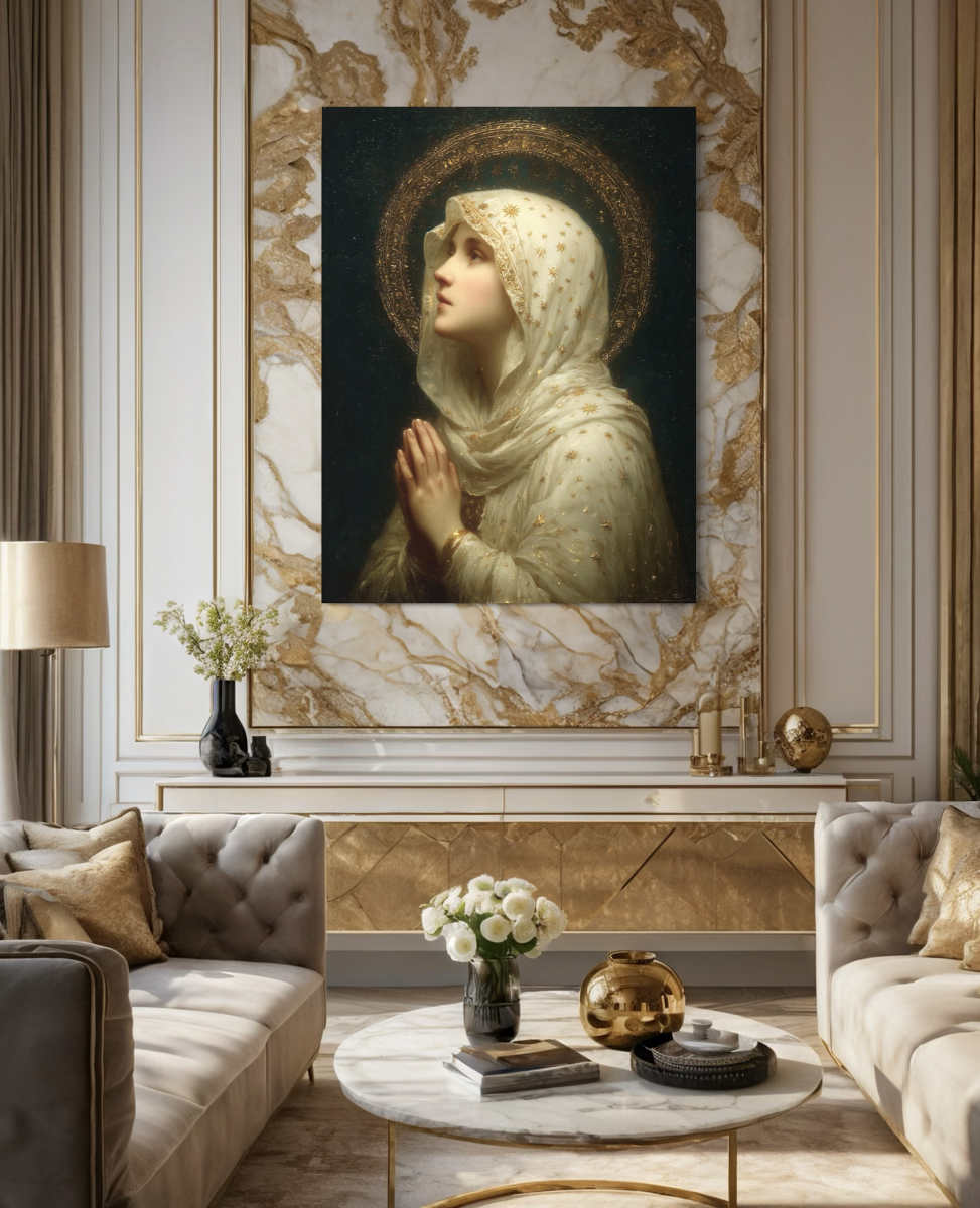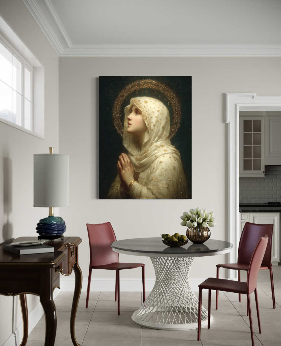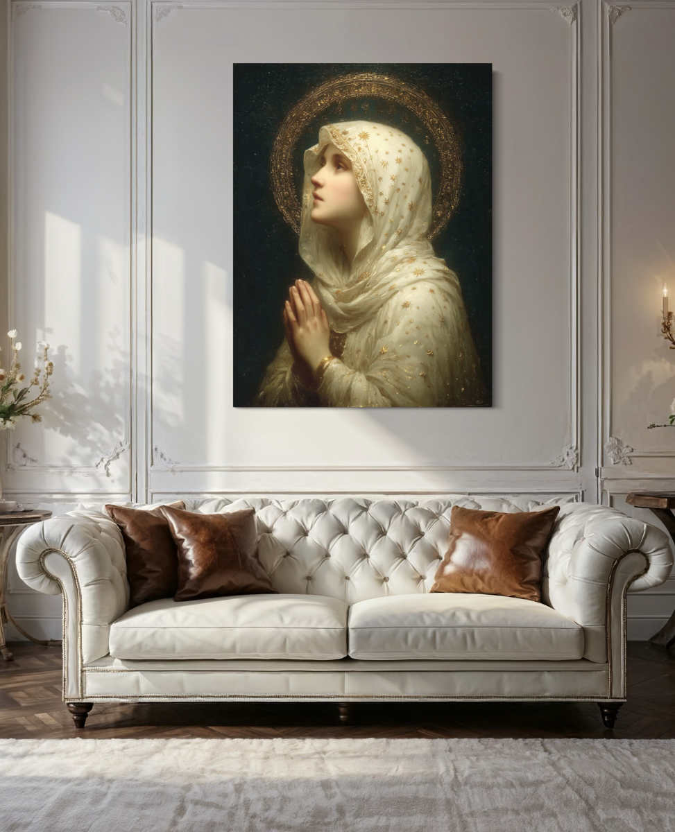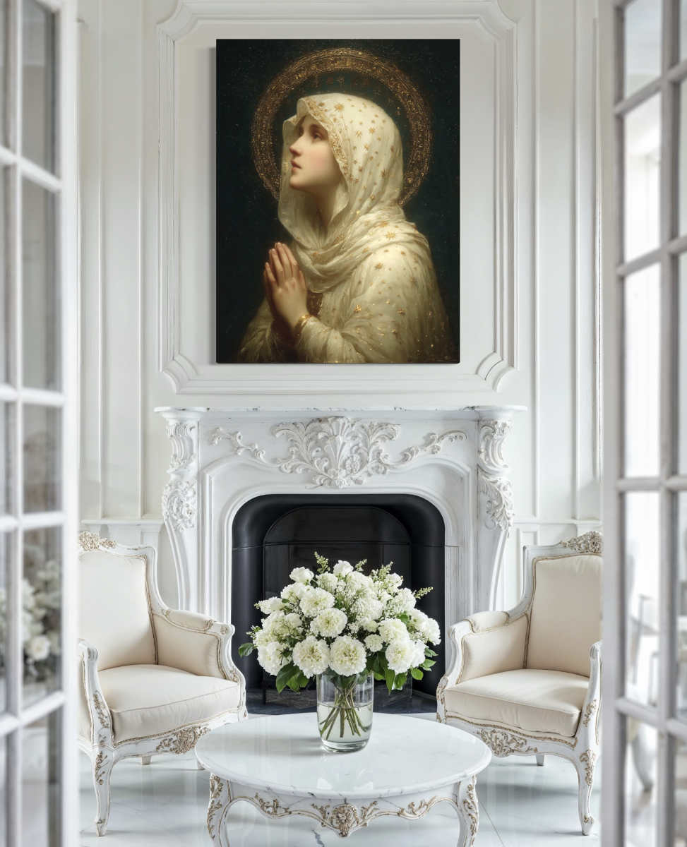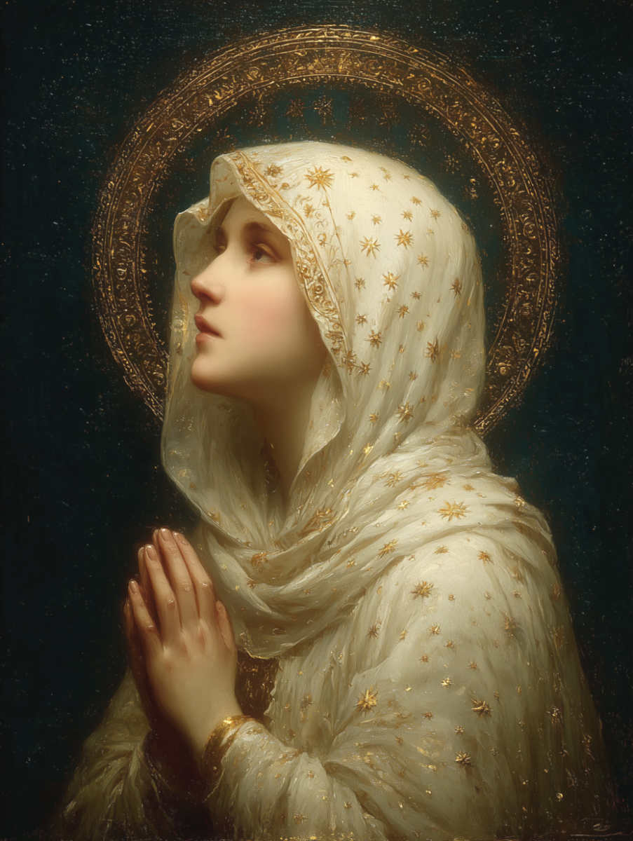 “Holy Light” captures the sacred stillness of the Virgin Mary, her hands clasped in prayer, her gaze lifted in serene devotion. Draped in a luminous white veil adorned with golden stars, and framed by an ornate halo, she embodies divine purity and grace.