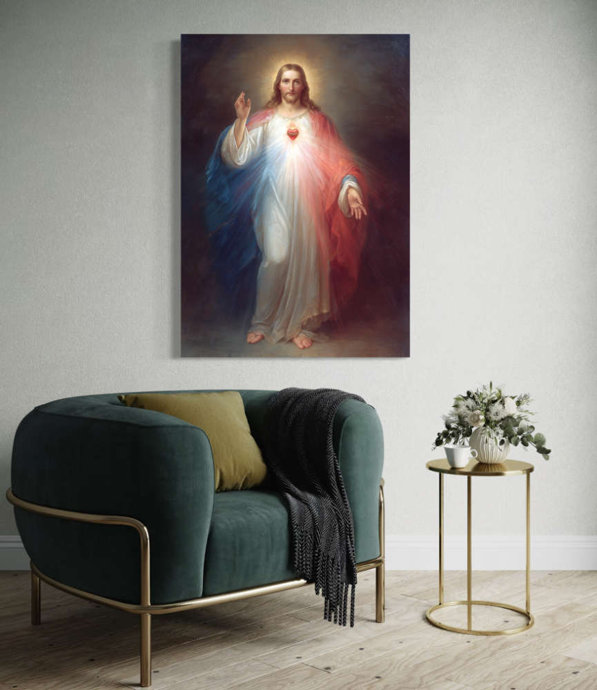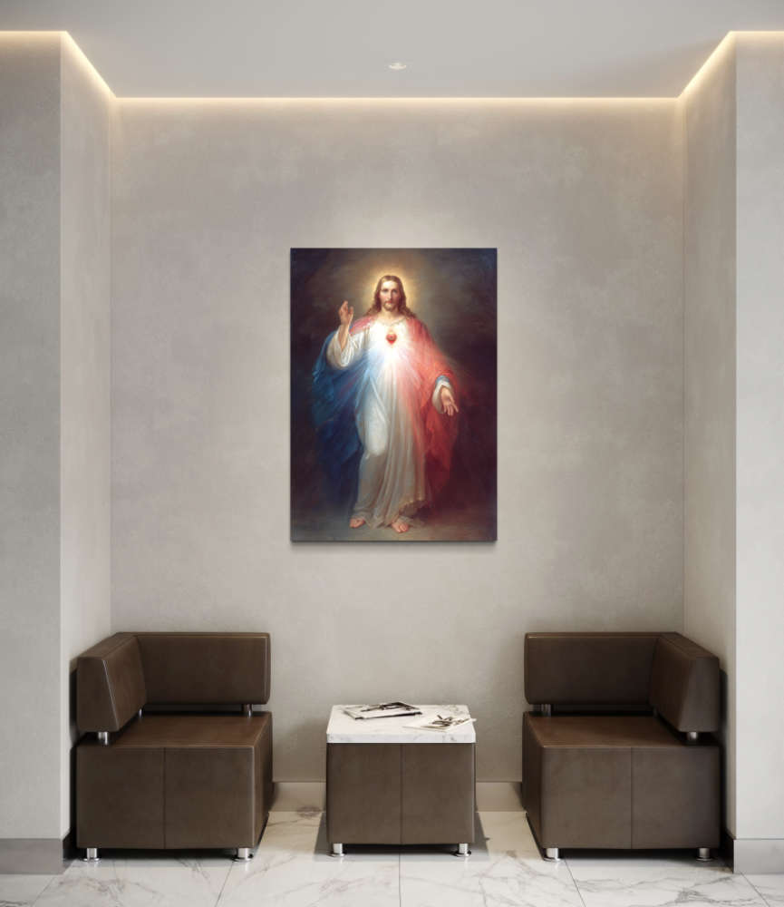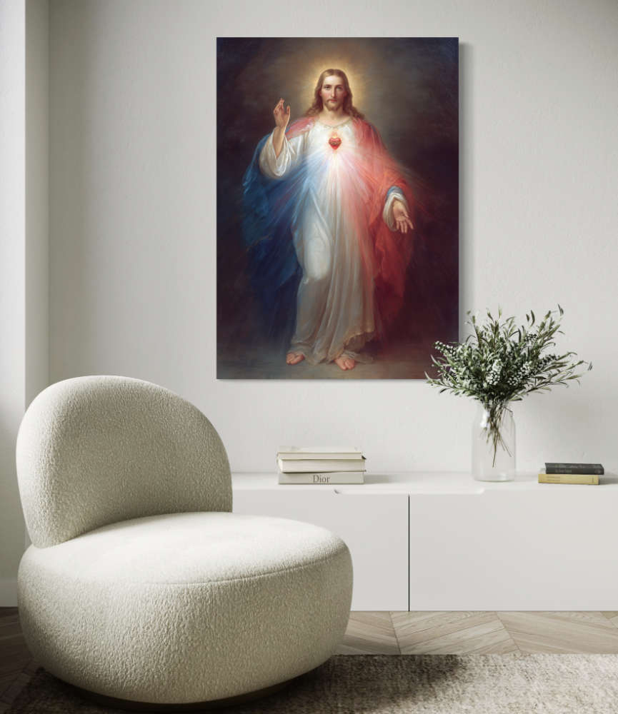 A sublime Giclée canvas print of the Divine Mercy of Jesus, radiating rays of red and white light symbolizing blood and water — the essence of compassion and salvation. The serene gaze of Christ and the flowing light from His heart embody mercy, peace, and forgiveness.