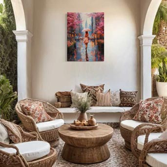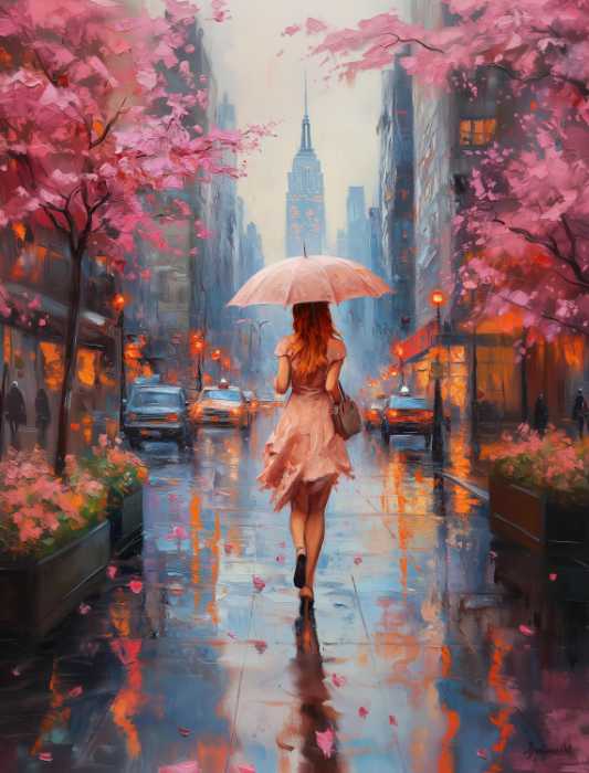 Immerse yourself in the romance and spring charm of Manhattan with this stunning reproduction of Spring Rain in Manhattan. The painting depicts a girl with an umbrella, leisurely strolling through the busy streets of New York, filled with delicate spring blossoms and reflections of lights in rainy puddles. The artistic canvas conveys a mood of freshness, dreaminess and urban charm, making it an ideal decoration for a stylish home, a cozy bedroom or a modern office.