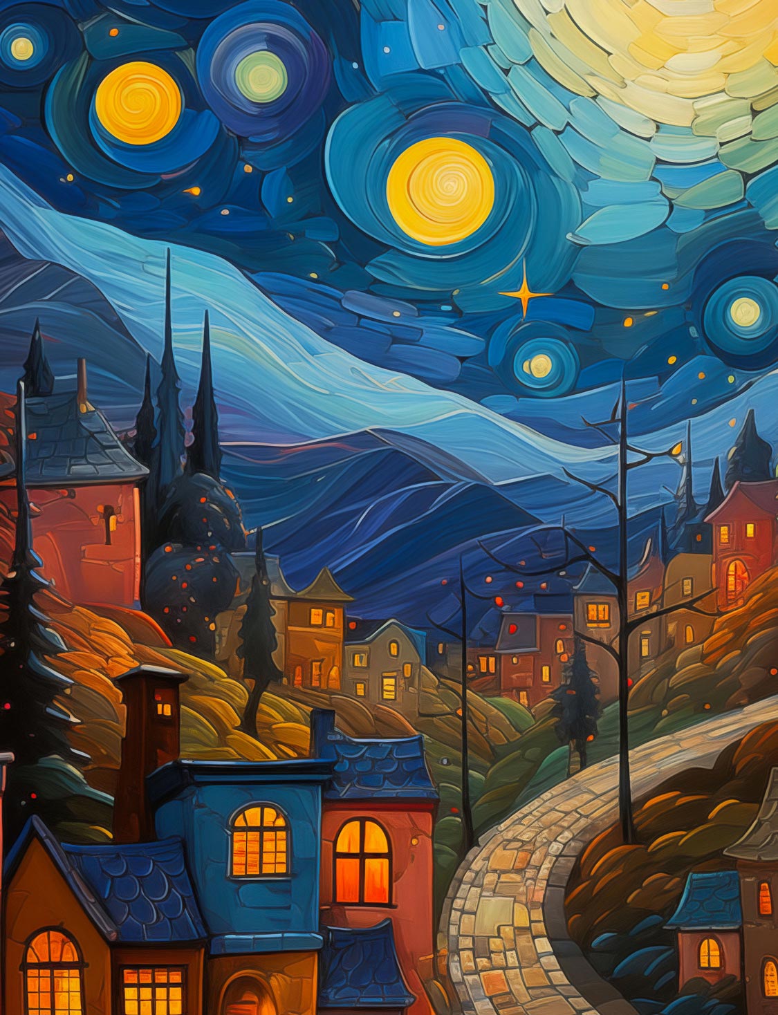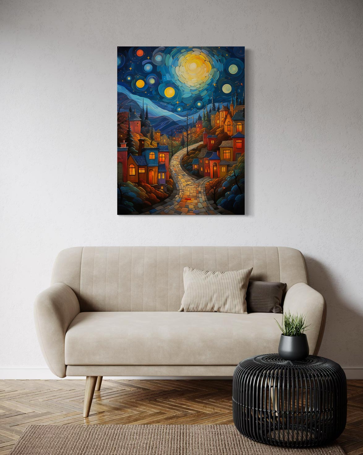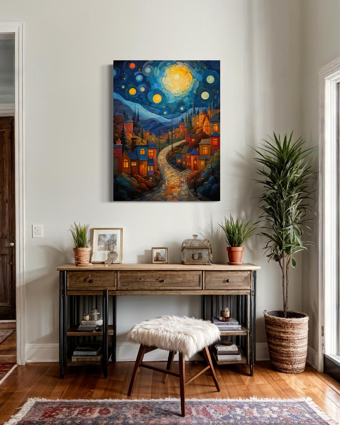 Immerse yourself in the enchanting charm of this Starry Night Dreamscape, an exclusive original giclée print that brings whimsical elegance and vibrant fantasy into your home. Inspired by the mesmerizing swirls of Vincent van Gogh, this artwork captures a serene nocturnal landscape filled with quaint houses glowing warmly beneath an expansive celestial sky.