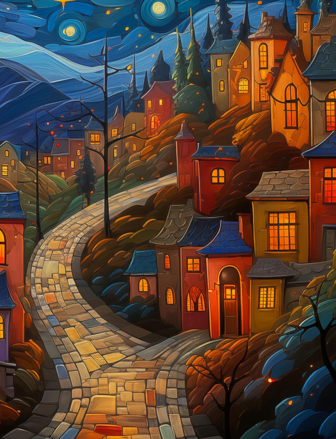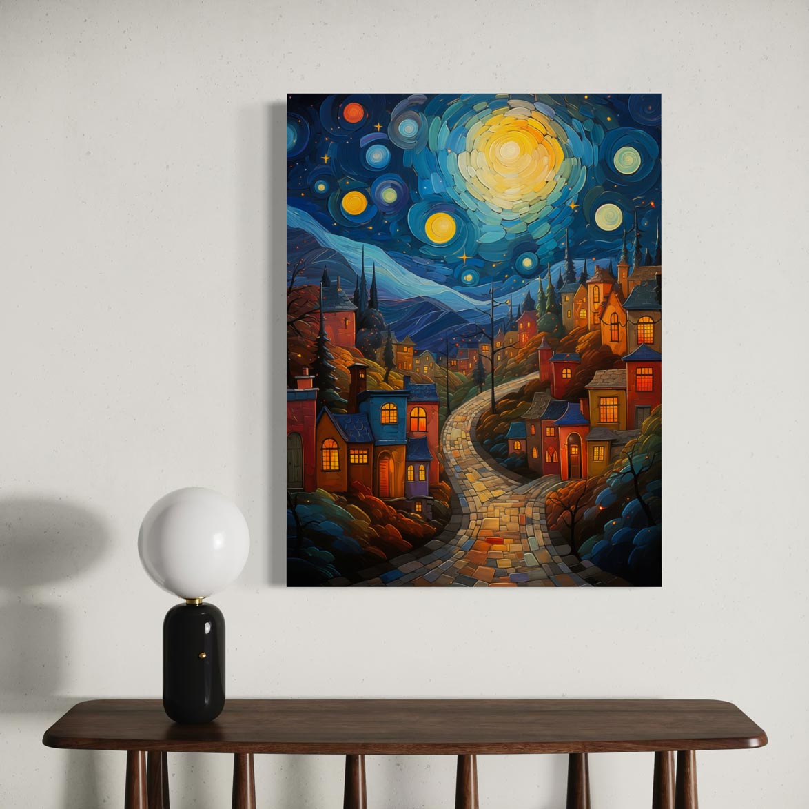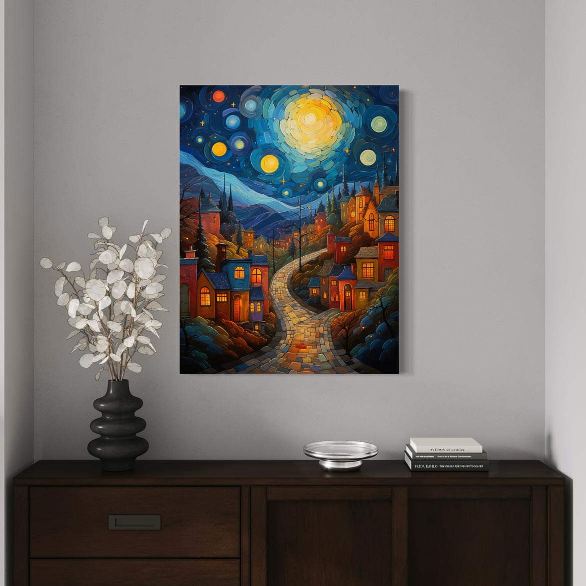 Immerse yourself in the enchanting charm of this Starry Night Dreamscape, an exclusive original giclée print that brings whimsical elegance and vibrant fantasy into your home. Inspired by the mesmerizing swirls of Vincent van Gogh, this artwork captures a serene nocturnal landscape filled with quaint houses glowing warmly beneath an expansive celestial sky.