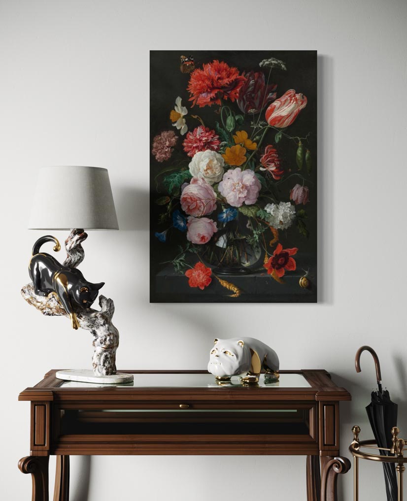 Step into the lavish world of the Dutch Golden Age with “Still Life with Flowers in a Glass Vase” by Jan Davidsz. de Heem (1650-1683). This exquisite masterpiece bursts with vivid blooms, meticulously rendered in glowing detail and vibrant hues. De Heem’s composition reflects both the precise observation typical of his Utrecht training and the rich, opulent flair of Flemish still-life art.
