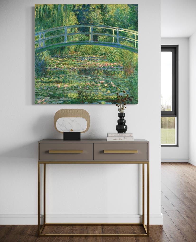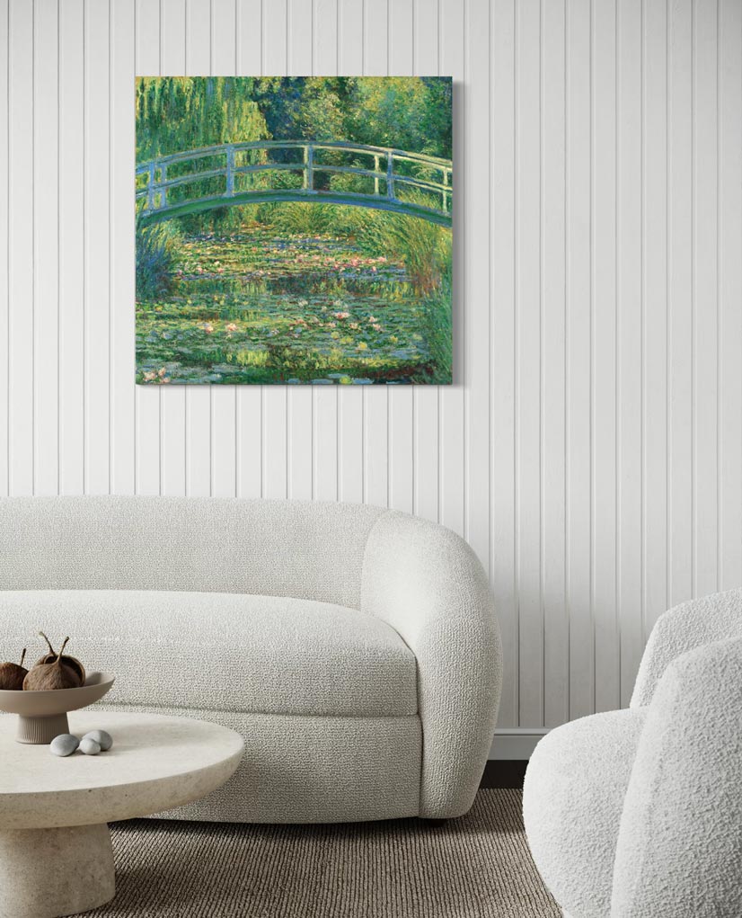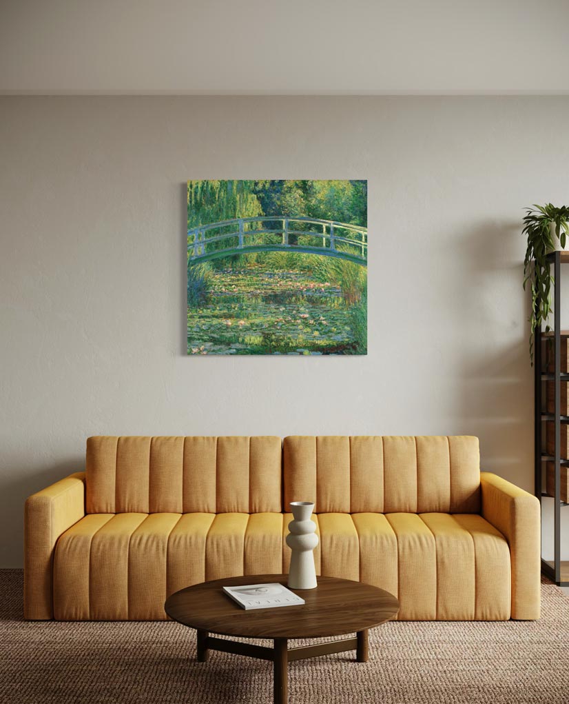 Immerse yourself in pure tranquility with “The Water-Lily Pond” by Claude Monet, painted in 1899 at his iconic garden in Giverny. This masterpiece captures the elegant curves of Monet’s Japanese bridge arching over a dreamy pond, shimmering with reflections of lush greenery and delicate water lilies. A symphony of greens, soft pinks, and dappled light brings nature’s harmony into your home, creating a serene atmosphere and timeless beauty.