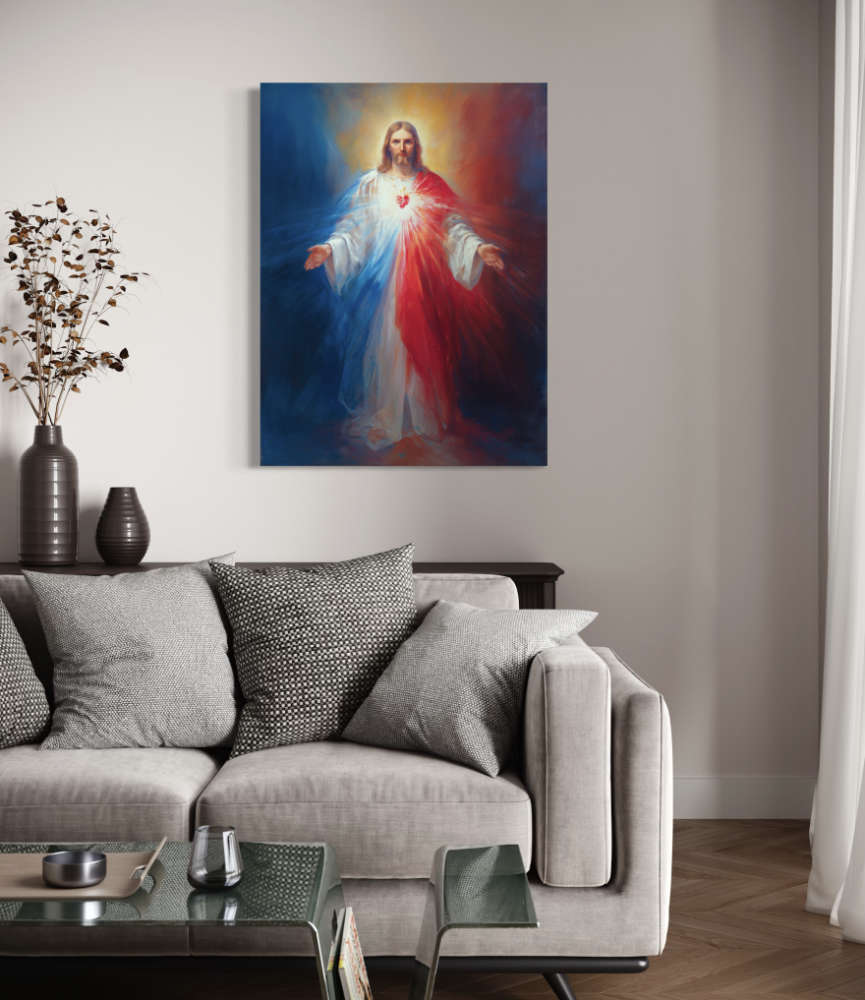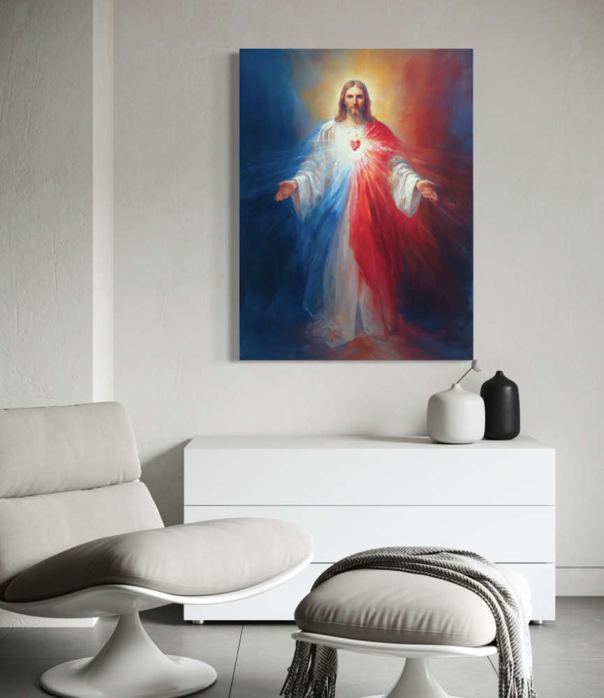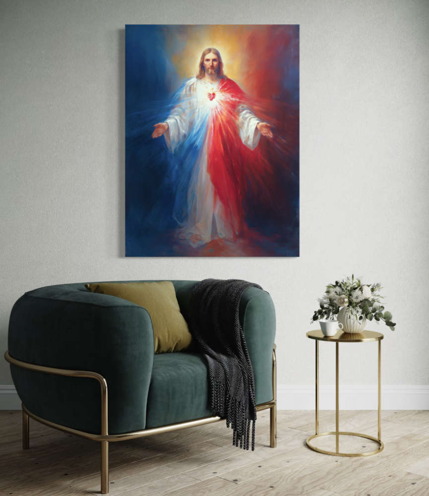 A sublime Giclée canvas print of the Divine Mercy of Jesus, radiating rays of red and white light symbolizing blood and water — the essence of compassion and salvation. The serene gaze of Christ and the flowing light from His heart embody mercy, peace, and forgiveness.