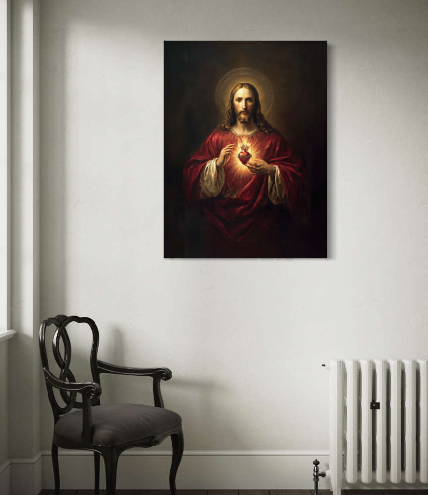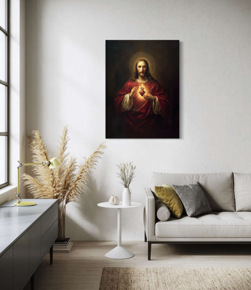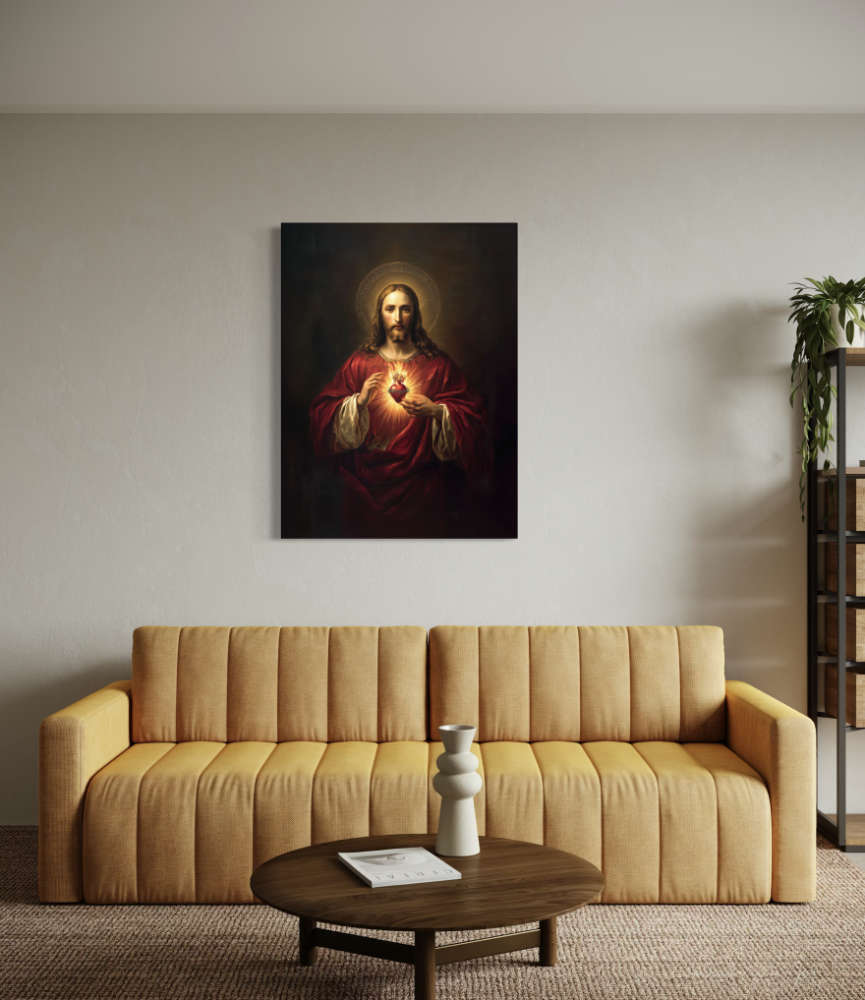 A magnificent Giclée canvas print of the Sacred Heart of Jesus, radiating divine compassion and eternal love. The artwork portrays Christ standing in soft, spiritual light, His heart aflame with mercy and devotion — a timeless symbol of faith, hope, and redemption.