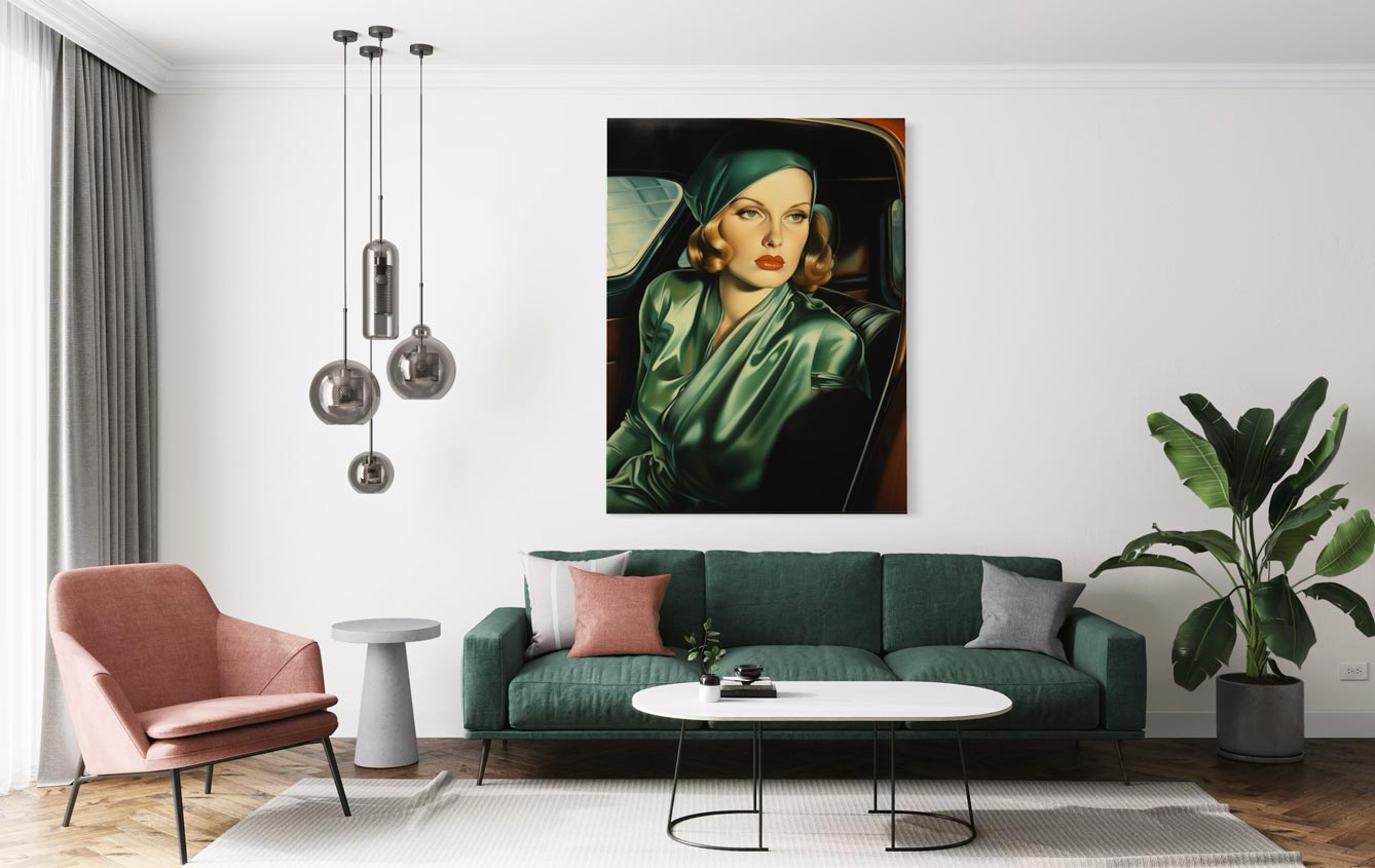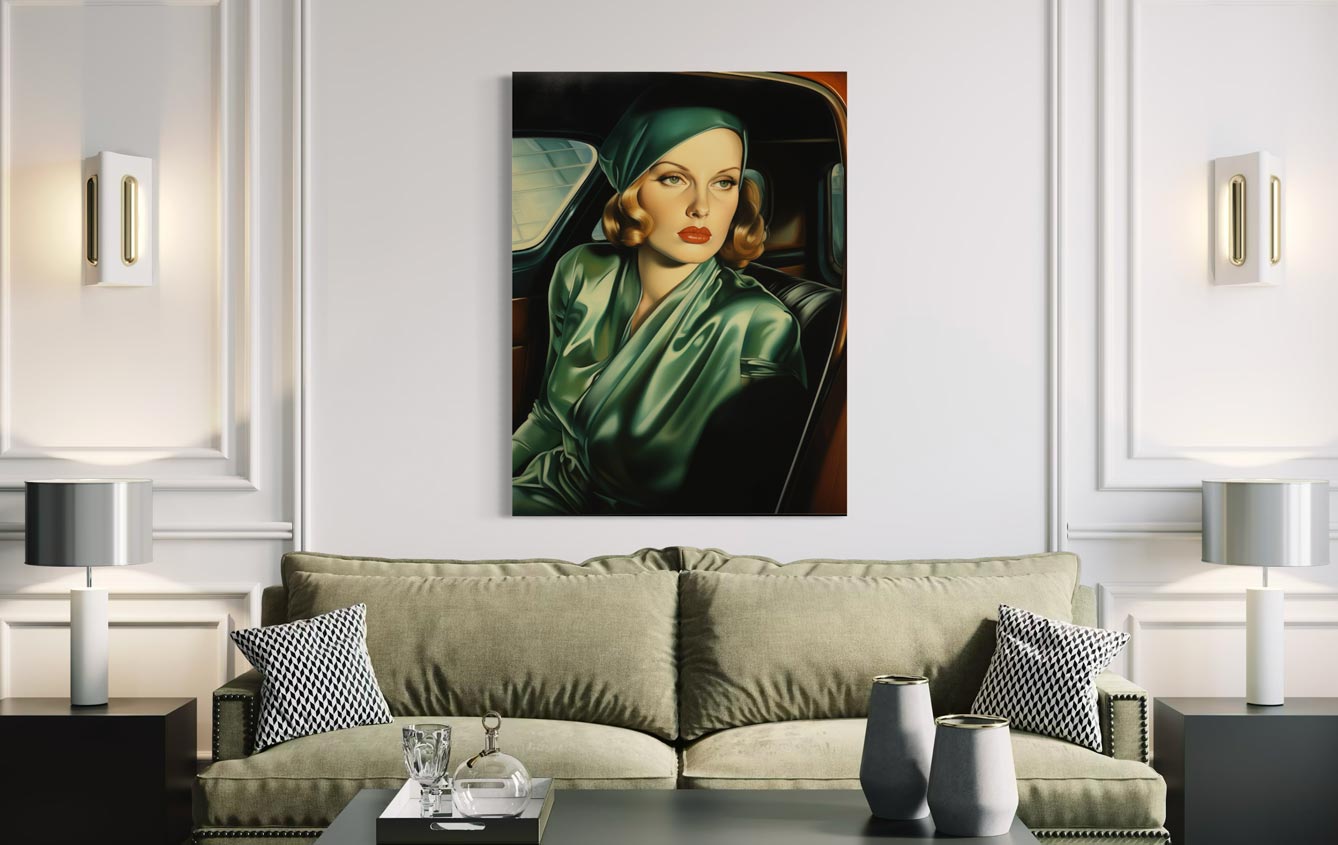 Produktinformationen "Porträt im grünen Auto – Giclée-Leinwand im Stil von Lempicka"