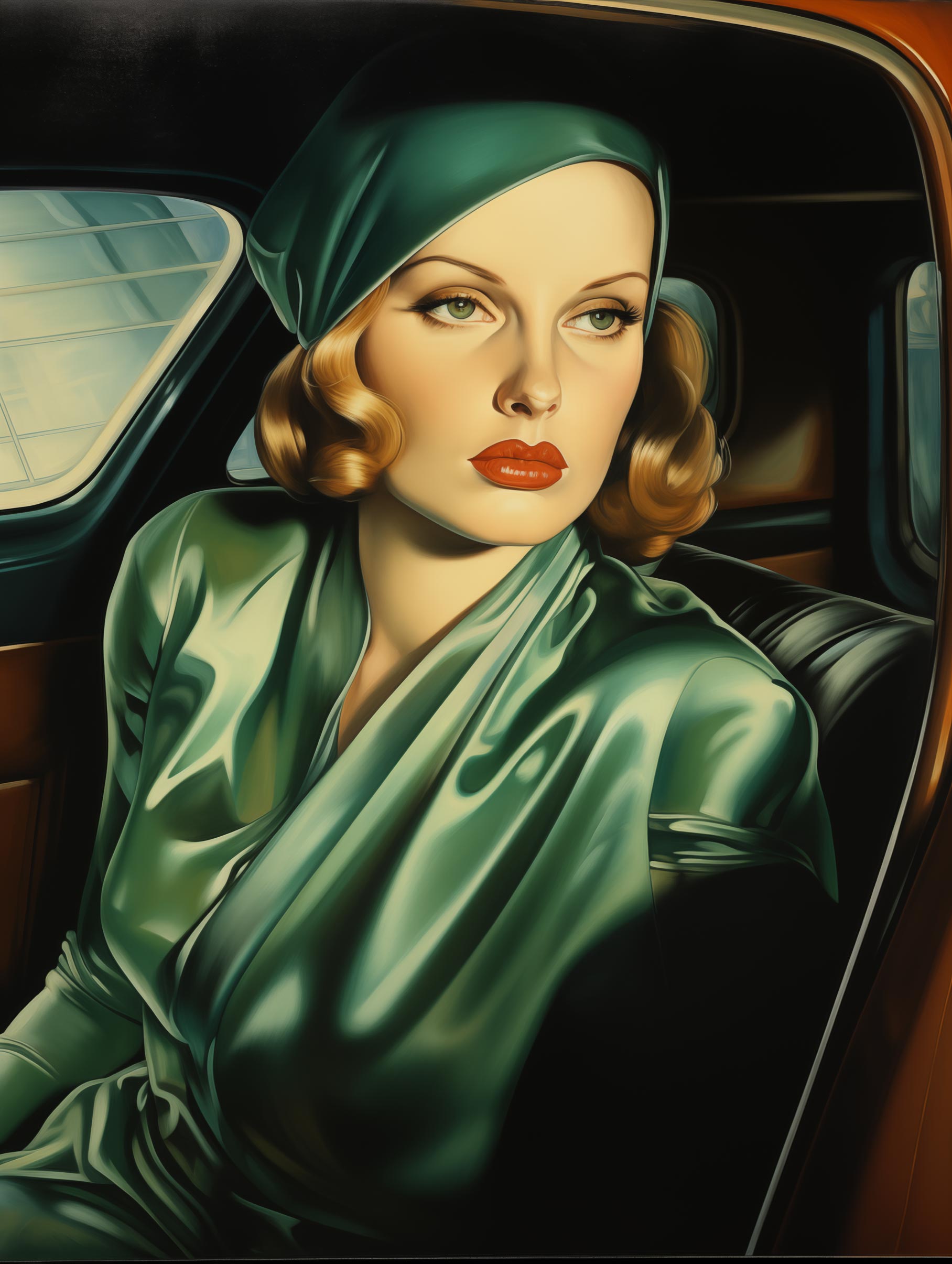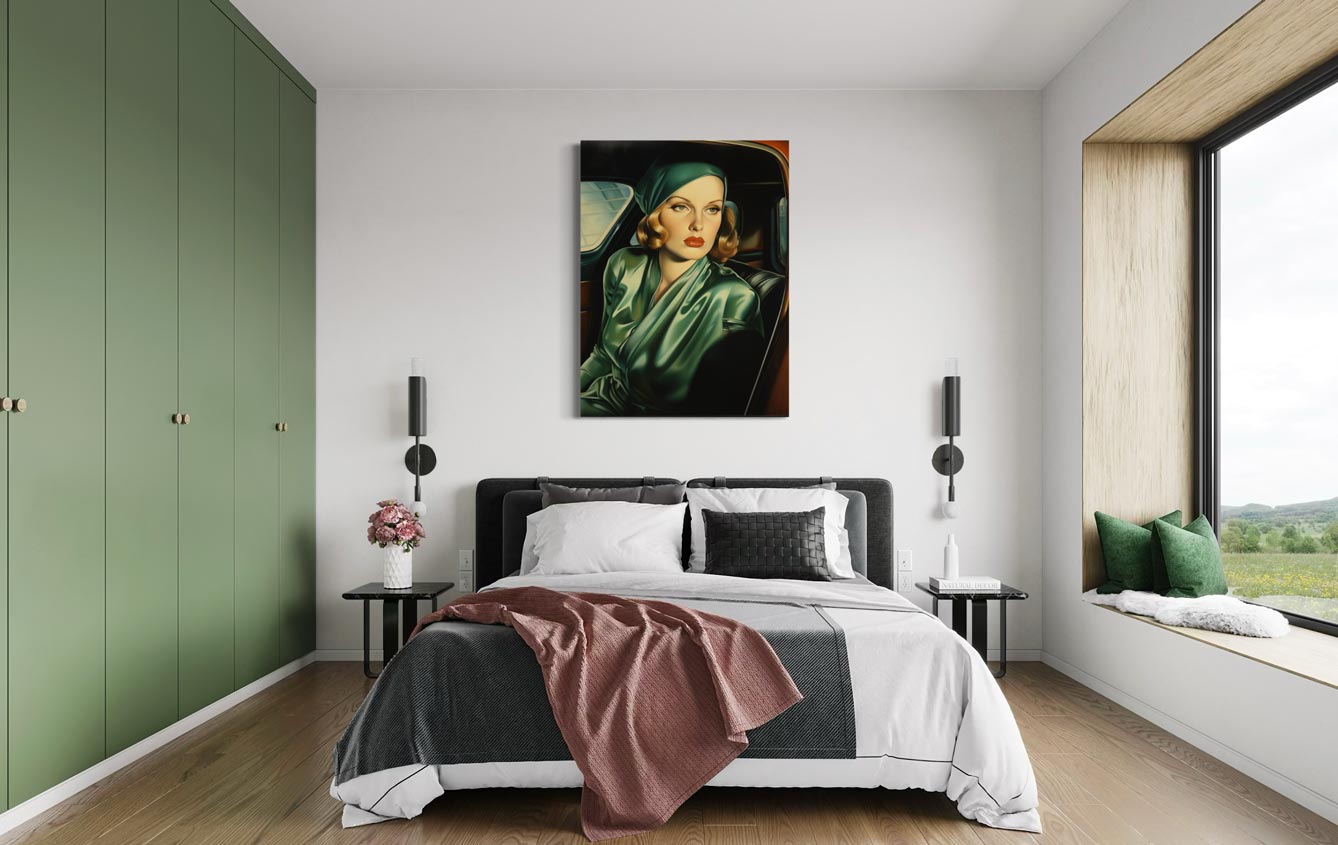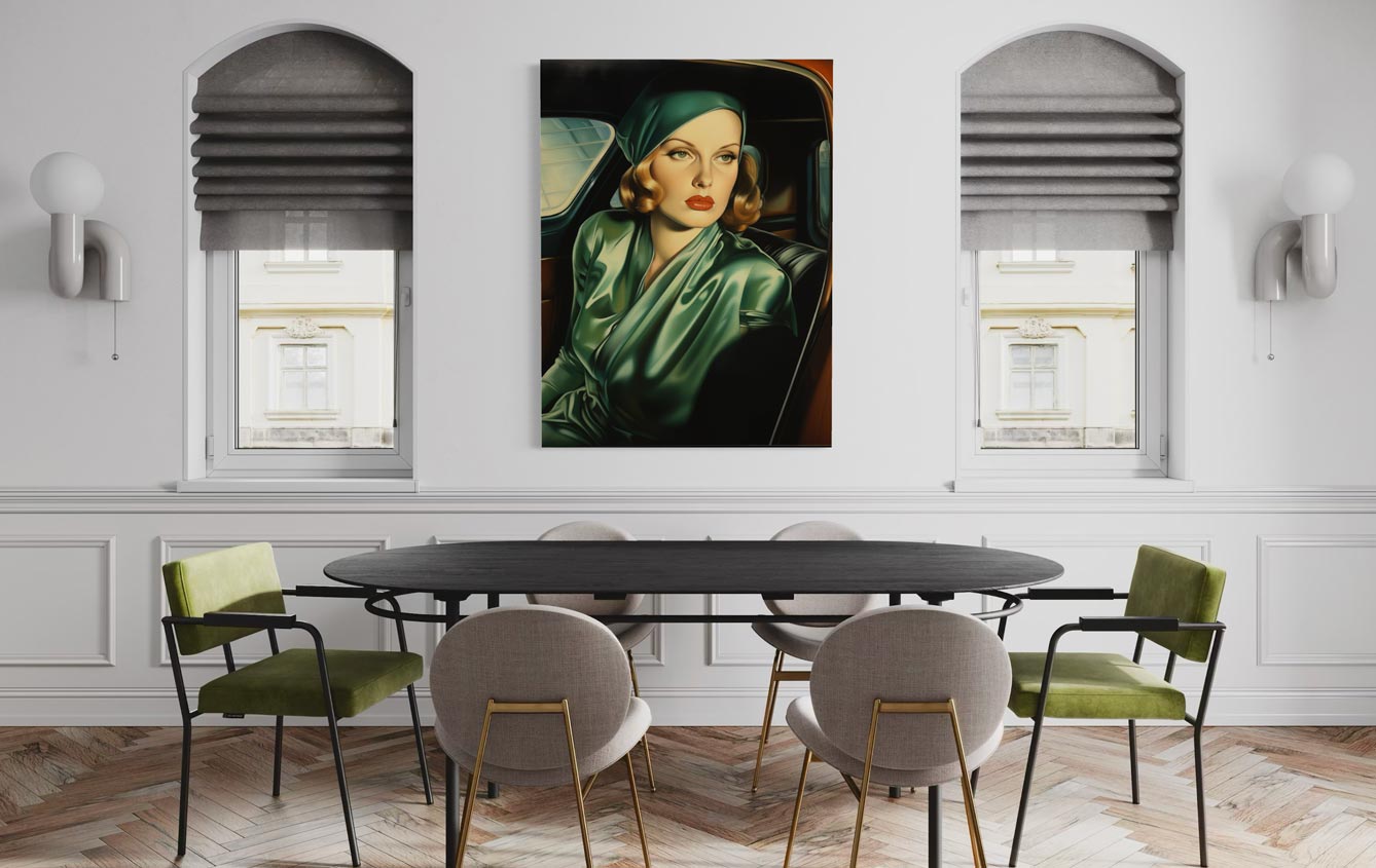Inspiriert vom ikonischen Stil Tamara de Lempickas präsentiert „Porträt im grünen Auto“ eine selbstbewusste Frau in einem glänzenden Seidenkleid, stilvoll sitzend im Inneren eines klassischen Wagens. Diese Giclée-Leinwand verkörpert den Glamour und die Selbstständigkeit der 1930er-Jahre – und zugleich die Zeitlosigkeit weiblicher Eleganz.