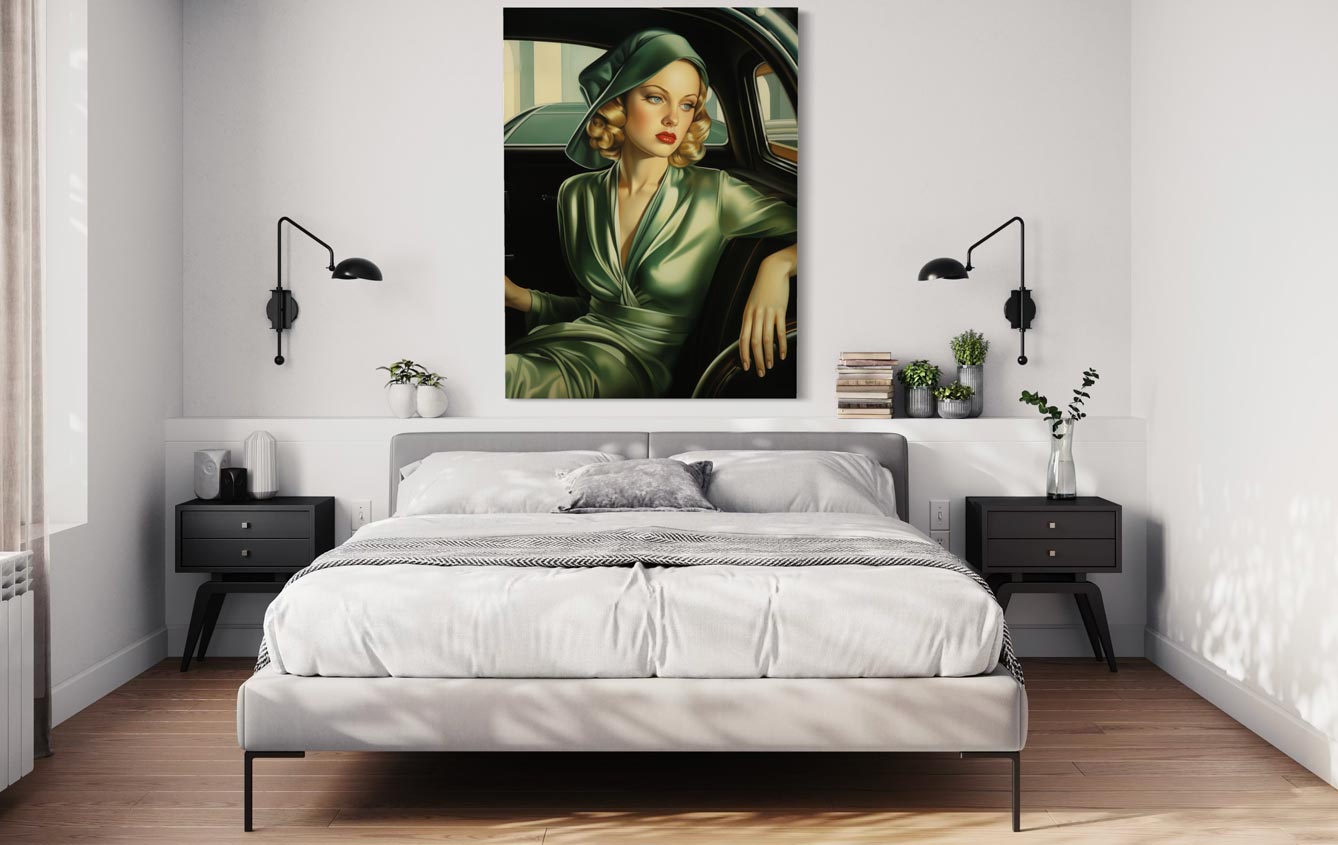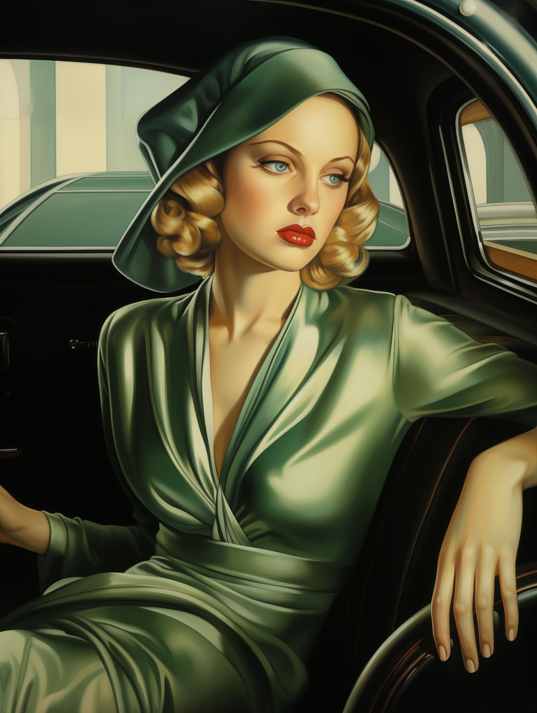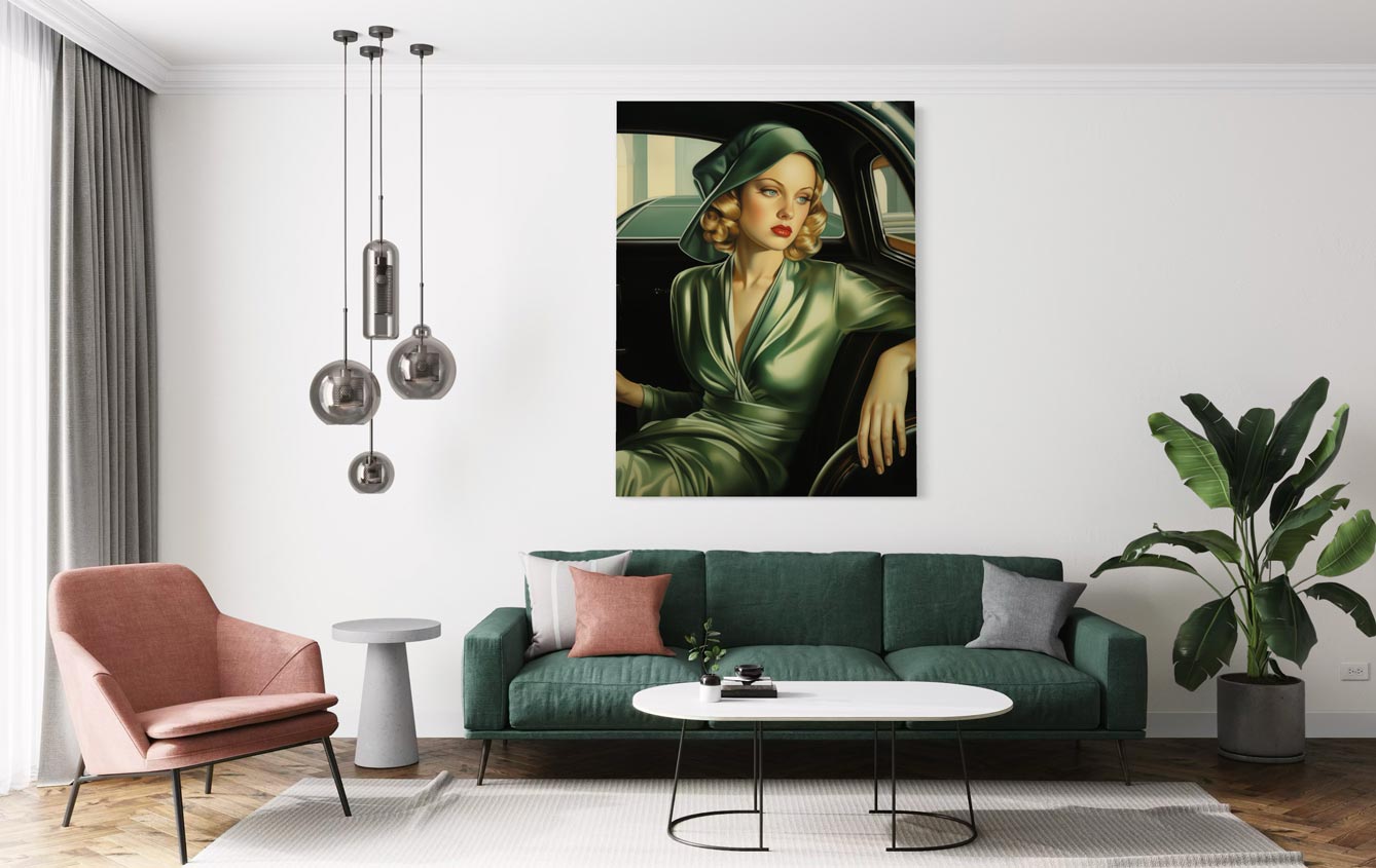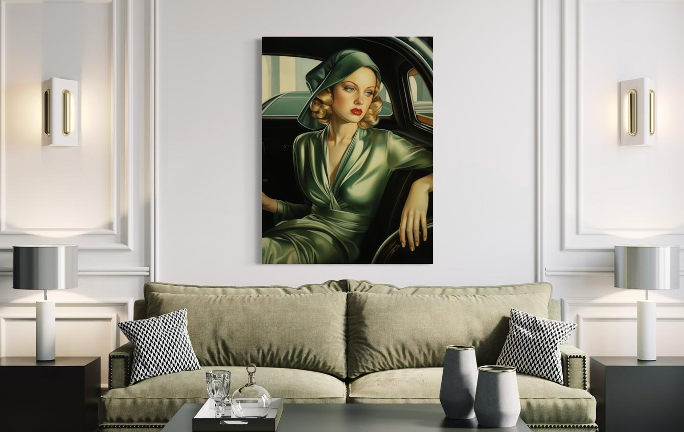 Tauchen Sie ein in den Glanz und die Selbstsicherheit der Art-déco-Ära mit diesem fesselnden Giclée-Leinwanddruck, der vom ikonischen Stil von Tamara de Lempicka inspiriert ist. „Selbstporträt im grünen Buick“ zeigt eine elegante Frau in einem seidig grünen Kleid auf dem Rücksitz eines luxuriösen Autos – eine Szene, die den unabhängigen Geist und die zeitlose Schönheit der 1930er Jahre perfekt einfängt.