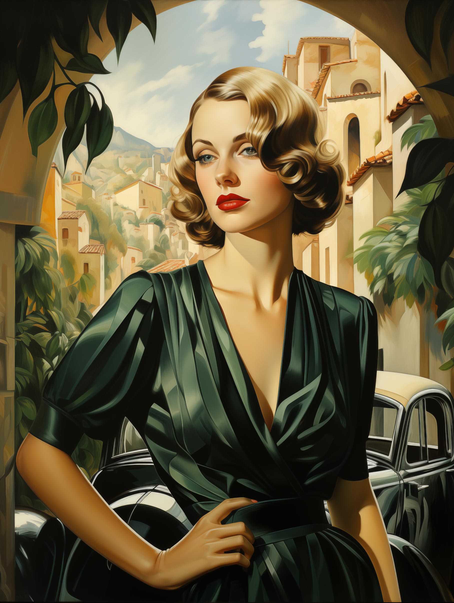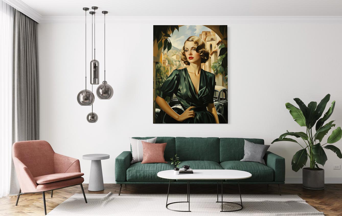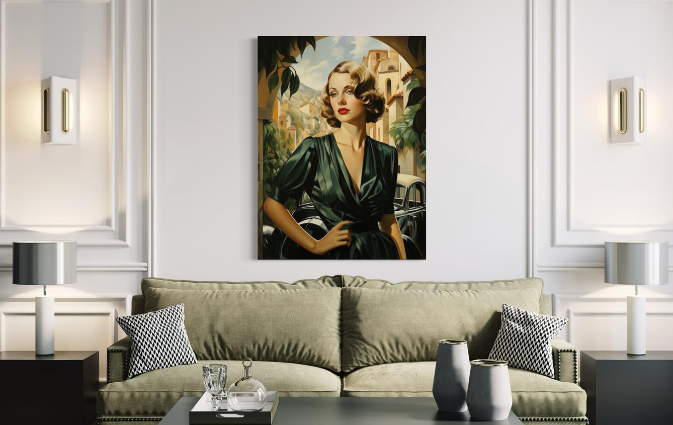 Feiern Sie die zeitlose Eleganz und das selbstbewusste Strahlen der Art-déco-Ära mit diesem ausdrucksstarken Giclée-Leinwanddruck, inspiriert vom unverwechselbaren Stil von Tamara de Lempicka. „Tamara in der Sonne“ zeigt eine glamouröse Frau im smaragdgrünen Kleid, stolz stehend vor einer sonnenverwöhnten Mittelmeerstadt. Die warmen Steinwände, das üppige Grün und das klassische Auto im Hintergrund erzeugen eine filmische Mischung aus Nostalgie, Freiheit und Raffinesse.