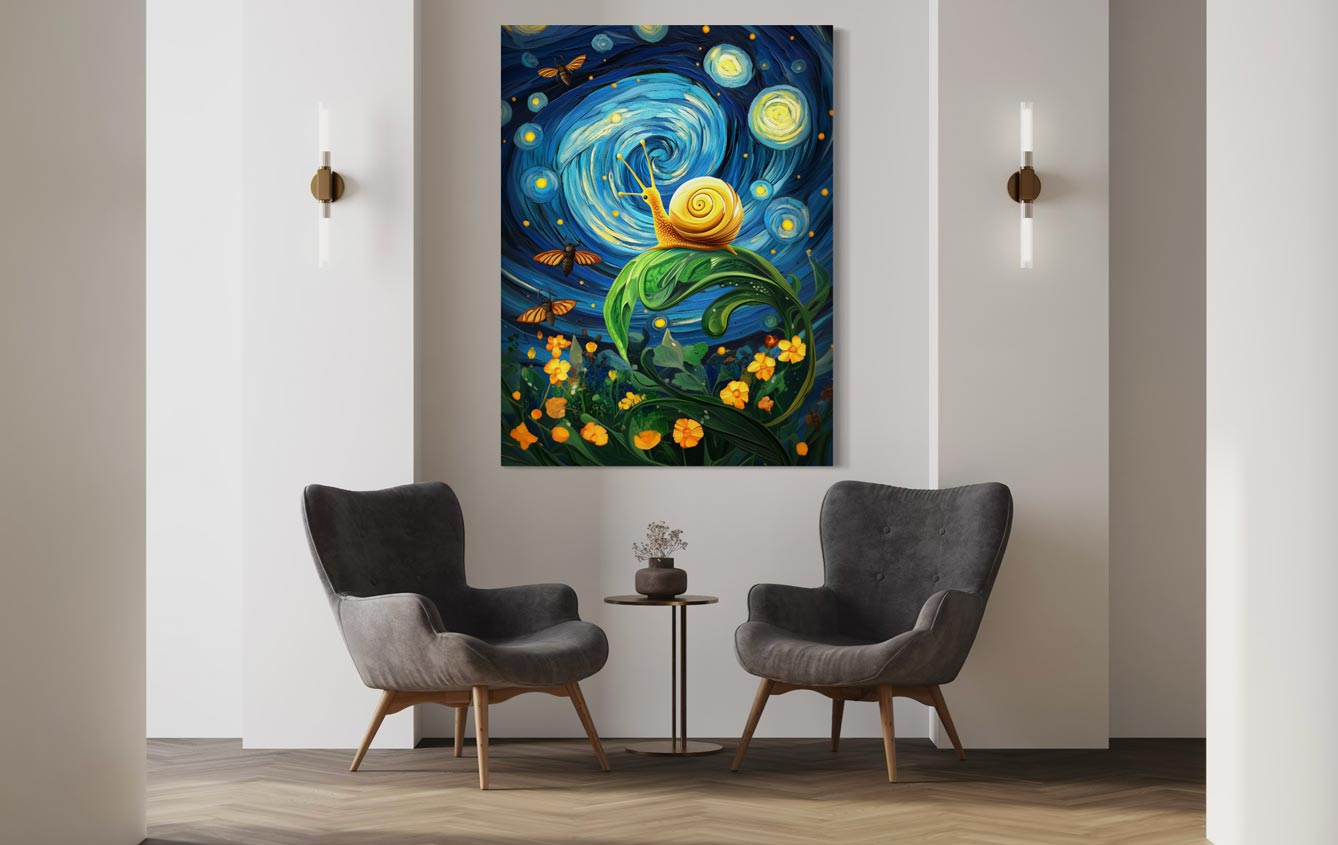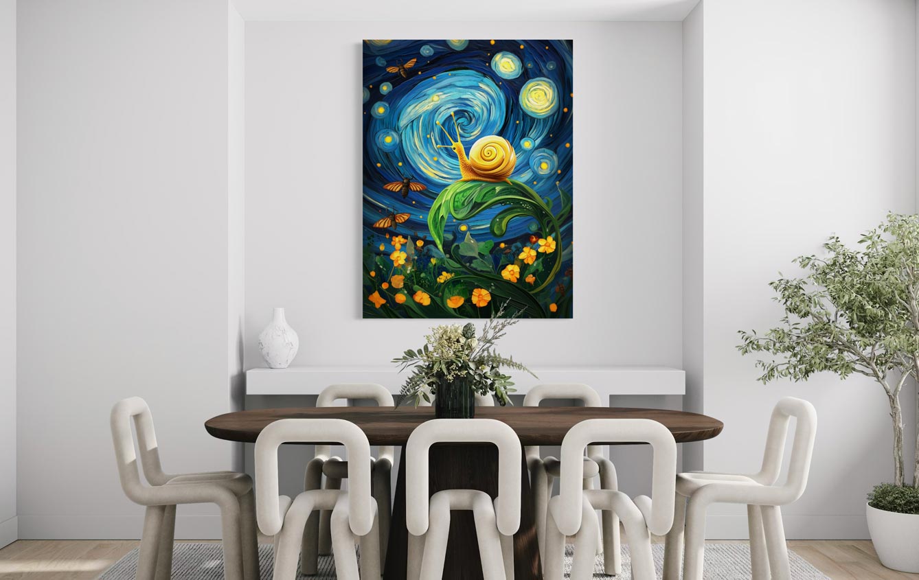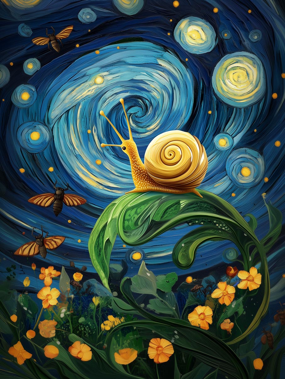 Entra en un mundo mágico donde un caracol dorado brilla bajo un cielo nocturno de remolinos y constelaciones. Este lienzo giclée de alta calidad fusiona arte, humor y fantasía en una escena original y encantadora, inspirada por la obra Noche estrellada de Van Gogh.
