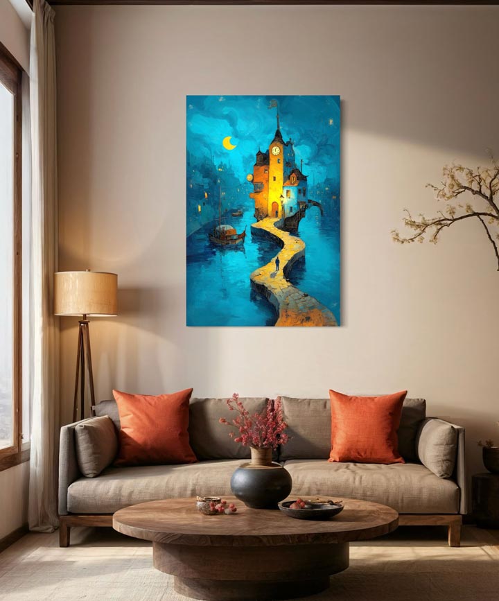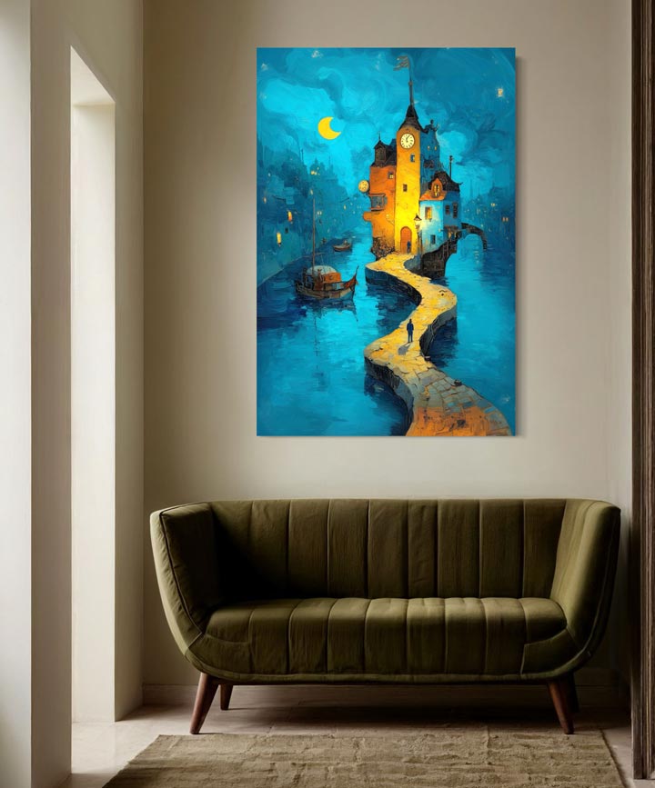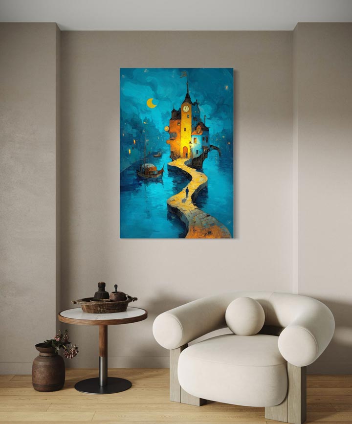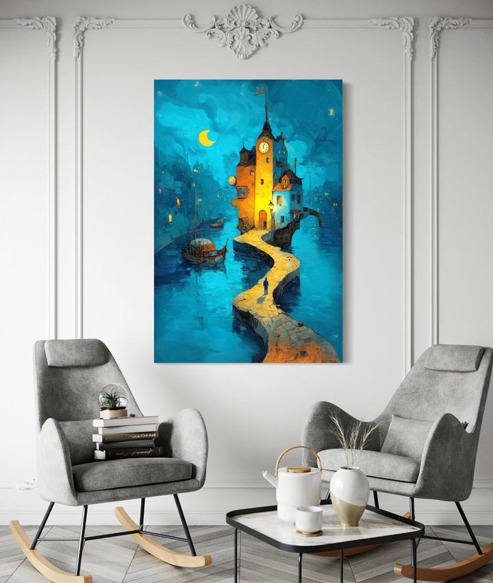 Bienvenido a “Puerto de Medianoche”, una escena onírica en la que la ciudad duerme bajo una luna creciente y faroles titilantes. Este impresionante lienzo giclée captura la calma de la noche, con caminos curvos, arquitectura fantástica y canales en silencio.