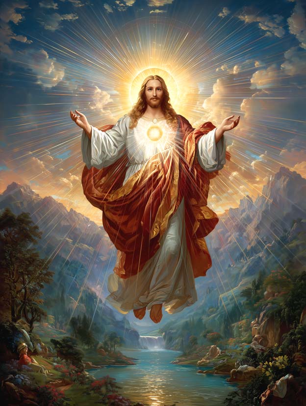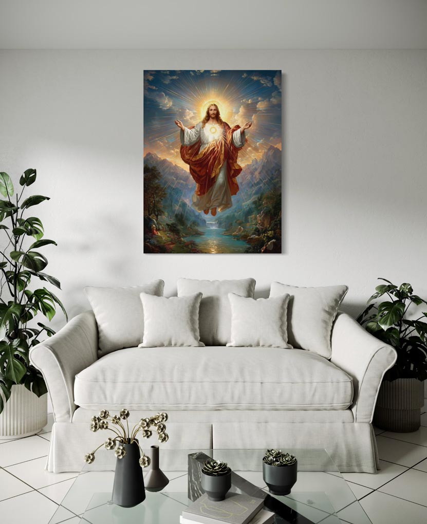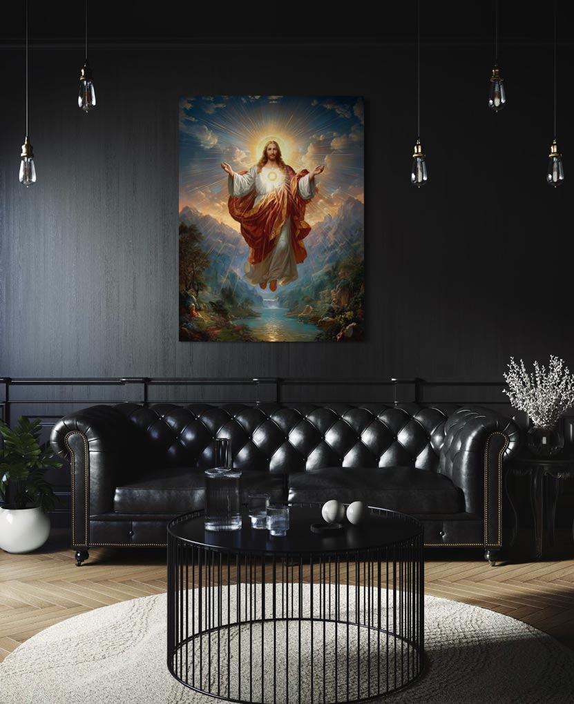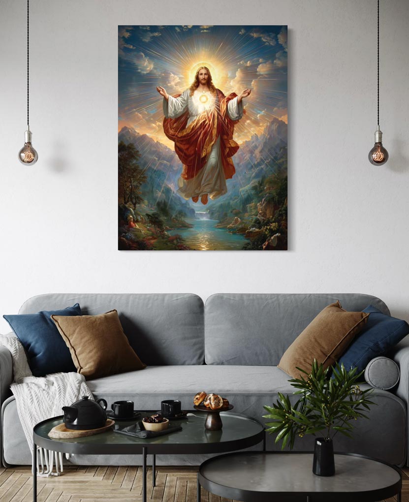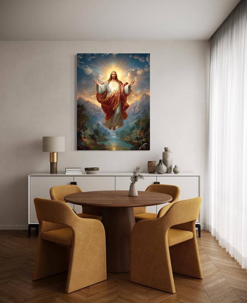 Esta impresionante pintura representa a Jesucristo ascendiendo en gloria, irradiando luz divina desde Su Sagrado Corazón. Rodeado de rayos dorados y enmarcado en un paisaje celestial de montañas, la figura de Cristo transmite majestuosidad y serenidad. Su túnica blanca y manto rojo simbolizan pureza y sacrificio, mientras que sus brazos abiertos invitan al espectador a un espacio de amor eterno y elevación espiritual.