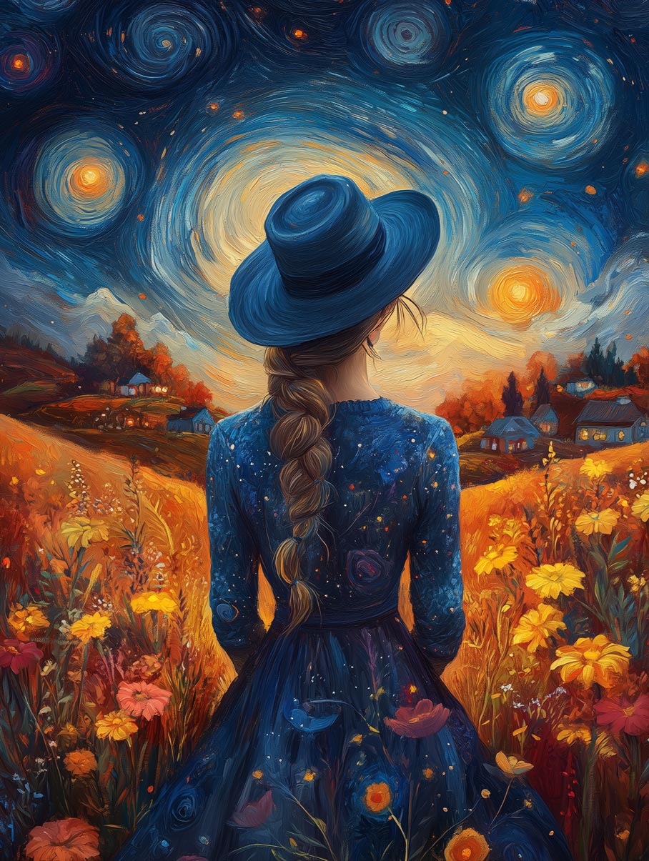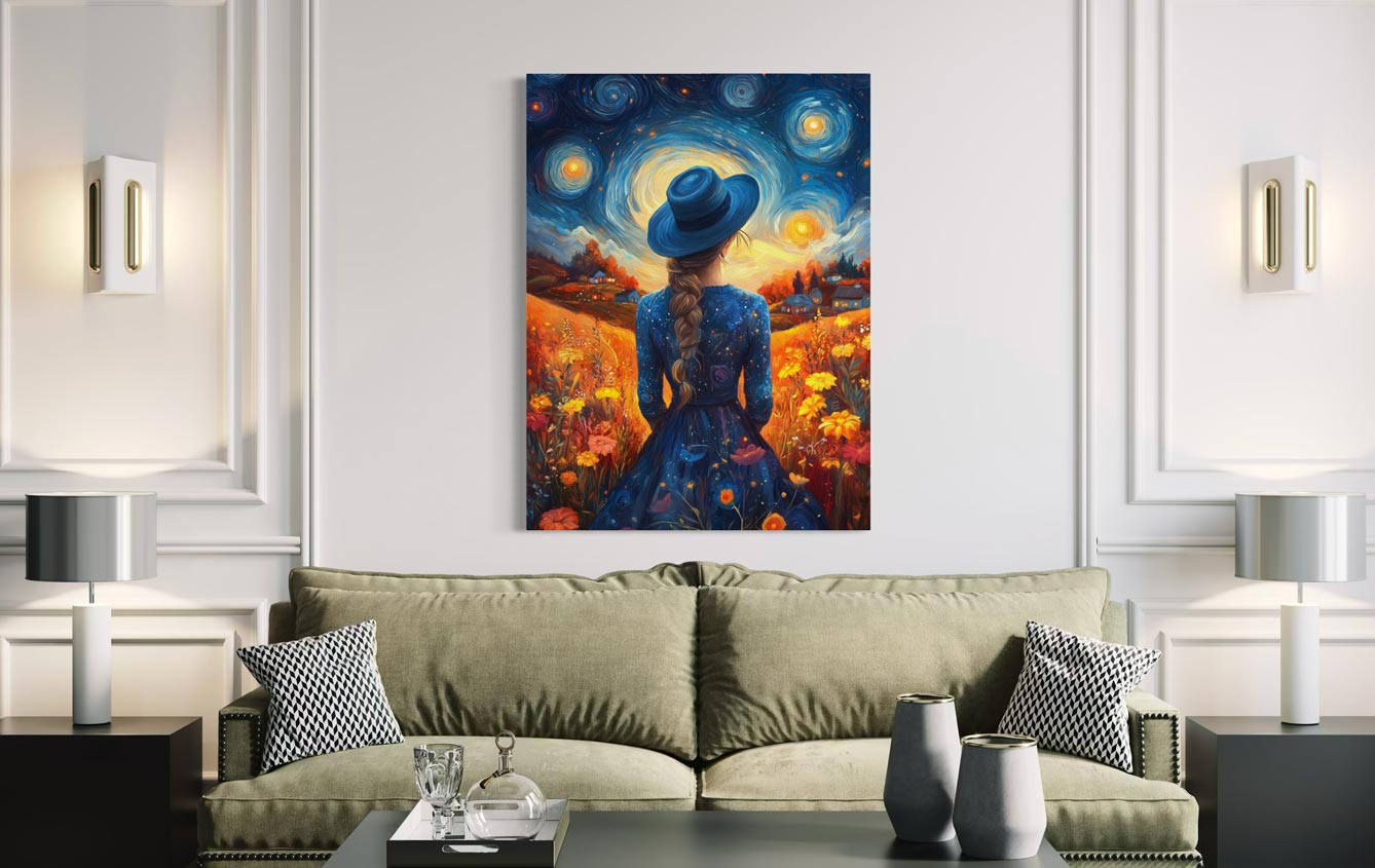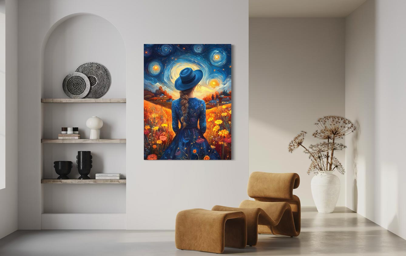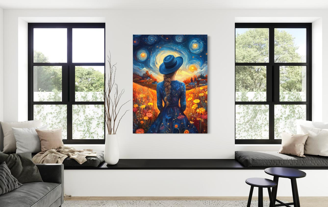 Una donna osserva un cielo stellato in movimento, immersa in un campo di fiori dorati. Questa stampa giclée ricca di atmosfera e colore richiama il celebre stile di Van Gogh e trasmette meraviglia, introspezione e poesia.