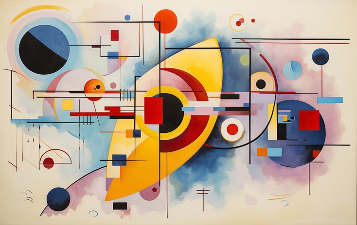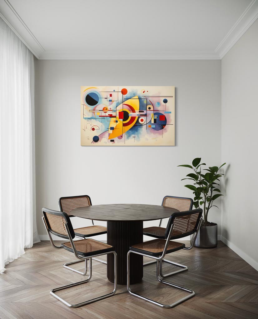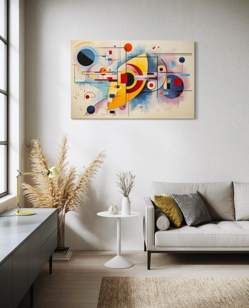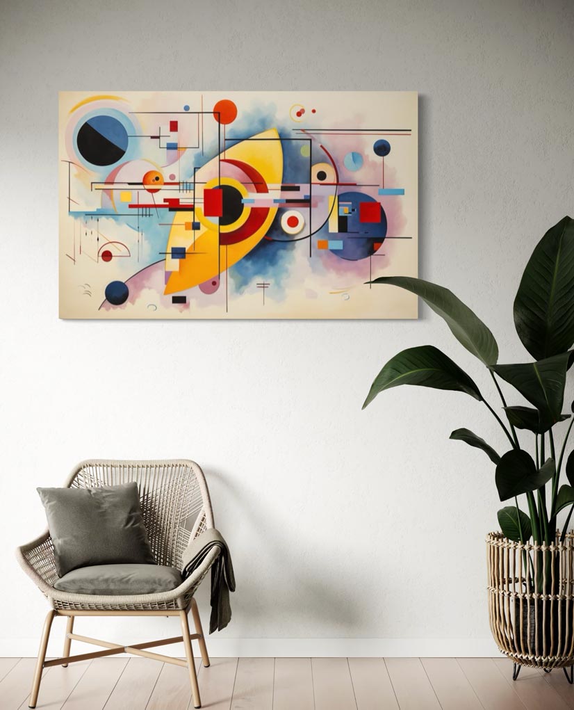 Immergiti in un mondo di colore, forma e pura astrazione con questa splendida stampa su tela giclée, ispirata allo spirito dei pionieri modernisti come Wassily Kandinsky. “Composizione Dinamica” esplode con linee intrecciate, forme geometriche e contrasti audaci, unendo tonalità vibranti di giallo, rosso, blu e nero su uno sfondo morbido e atmosferico.